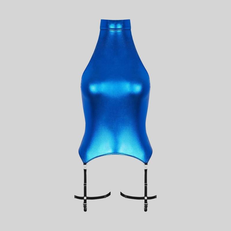 Blickdichtes, metallic-blaues Tanktop mit abnehmbaren Strumpfhaltern mit Schmetterlingsfesseln. Strumpfhalterform, die den Oberschenkel umschließt. Amerikanischer Ausschnitt mit unsichtbarem Reißverschluss im Rücken. Sehr eng anliegender Schnitt im Brustbereich.