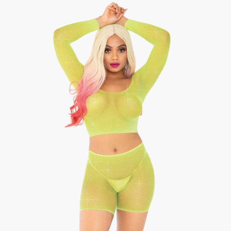 Entdecken Sie unser zweiteiliges Set aus gelbem Netzstoff, das für einen zusätzlichen Hauch von Glamour mit Strasssteinen in Diamantoptik verziert ist. Das Set besteht aus einem langärmeligen Crop-Top und einer passenden Radlerhose, die perfekt für einen gewagten und trendigen Look sind.