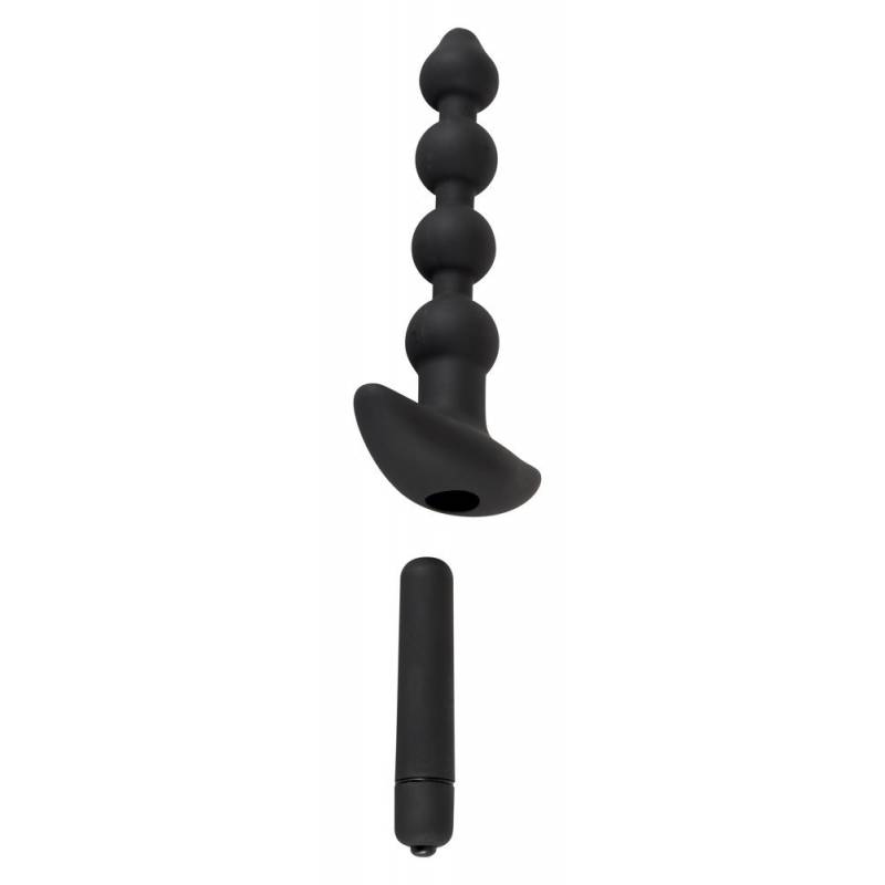 Analset aus schwarzem Silikon, bestehend aus einem klassischen Plug , einem Rosenkranzplug (Analperlen) und einer Intimdusche sowie einem "Bullet".