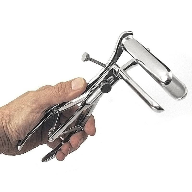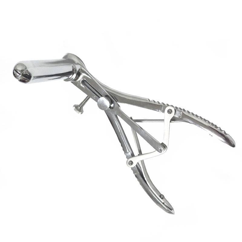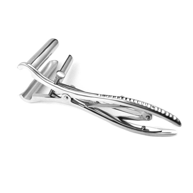 Analspekulum mit 3 Armen, aus medizinischem Stahl mit dem Stempel "Dèmonia", mit einer Stellschraube am Griff, mit der die Spreizung beibehalten werden kann.