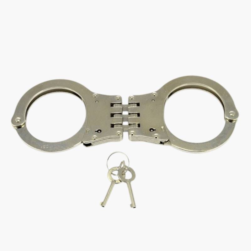 Handschellen aus Metall (vernickelter Stahl), mit Scharnieren und Schlüsseln zum Öffnen.