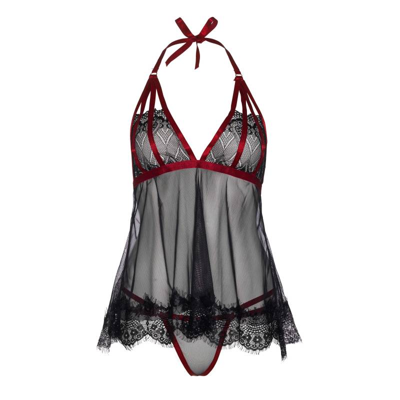 Kurzes Babydoll aus Voile und Spitze, verziert mit roten Satinbändern im Brustbereich und einer Schleife im Rücken, die Ihren hübschen Po erahnen lässt.