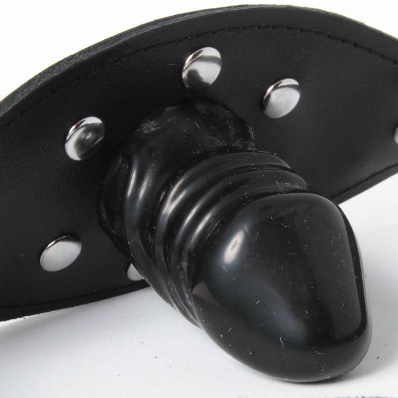 Knebel aus schwarzem Leder mit verstellbarem Riemen ( 11 Positionen ) weich, bestehend aus einem Innenpenis aus Latex auf einem breiten, steiferen und genieteten Lederstück.