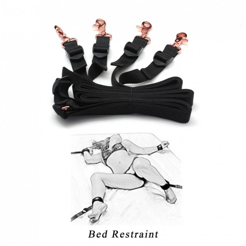 Zwangsbindungen für das Bett , aus Nylon mit roségoldenen Karabinerhaken.