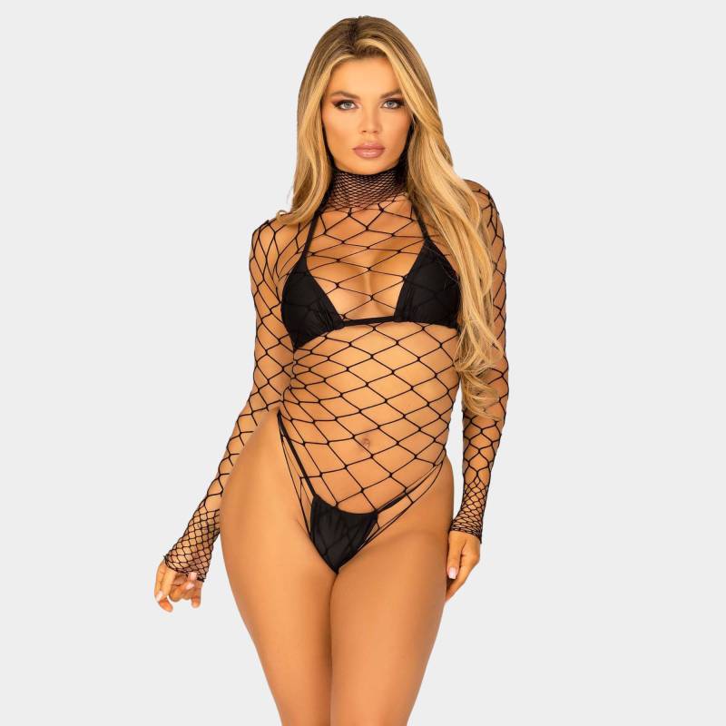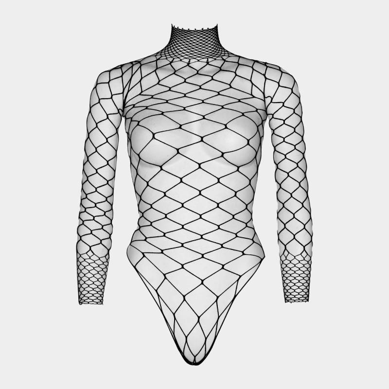 Entdecken Sie den schwarzen Body mit sehr großen Netzen der berühmten Marke LEG AVENUE. Mit seinen langen Ärmeln ist er sexy und gewagt zugleich. Der Body ist tief ausgeschnitten und reicht bis über die Hüften, während die Rückseite in String-Optik gehalten ist, um einen ultraverführerischen Look zu erzielen.