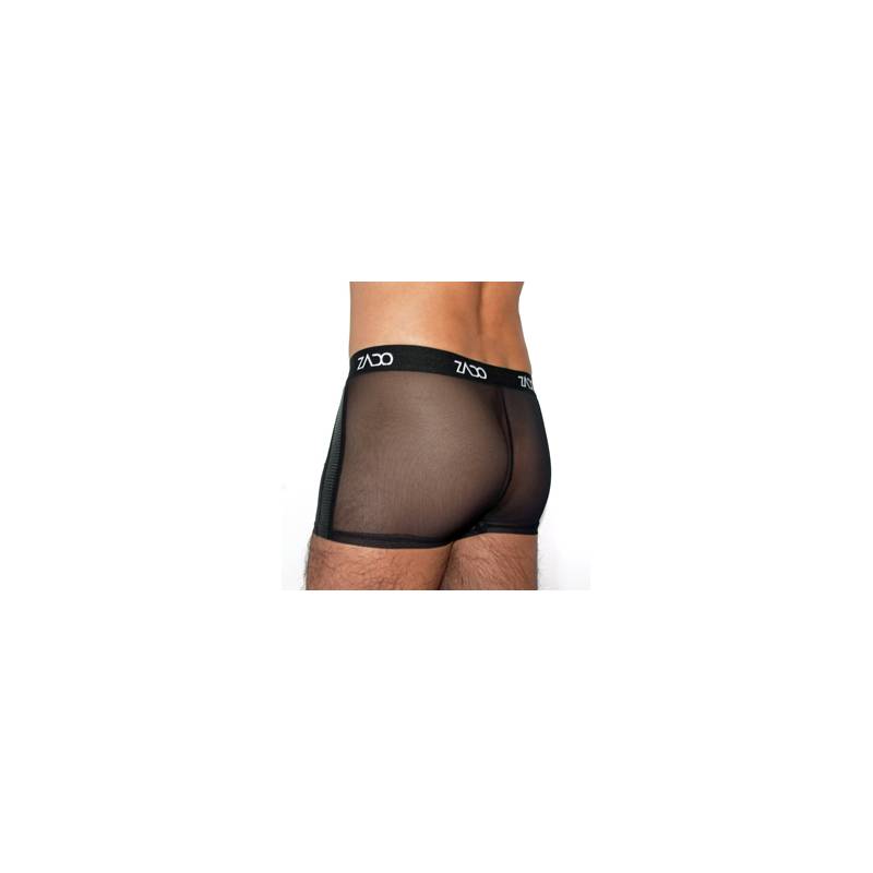 Sexy und originelle Boxershorts aus transparentem Voile auf der gesamten Rückseite und den Seiten und perforiertem Leder auf der Vorderseite im Bereich des Geschlechts. 2 kleine Rückholbänder, ebenfalls aus perforiertem Leder, zieren die Hüften.