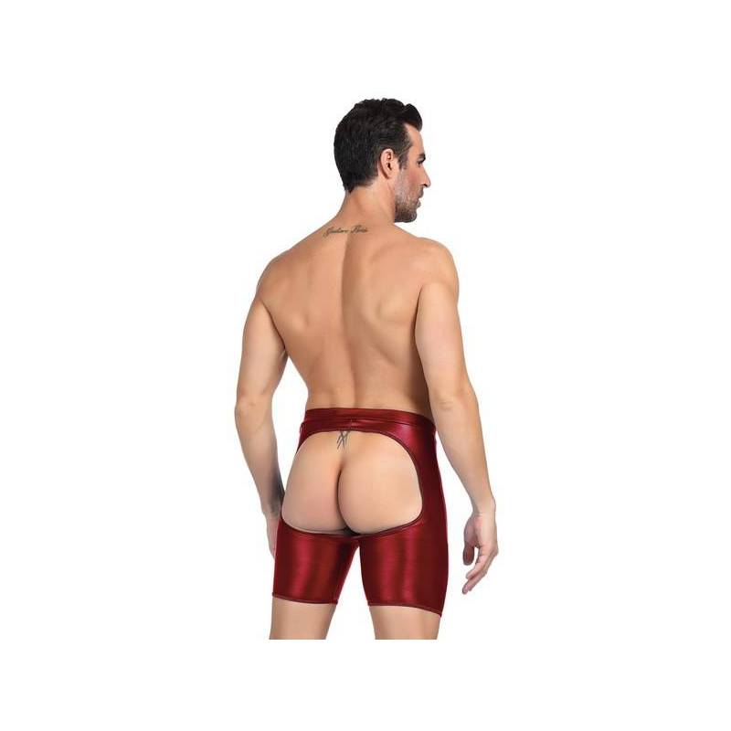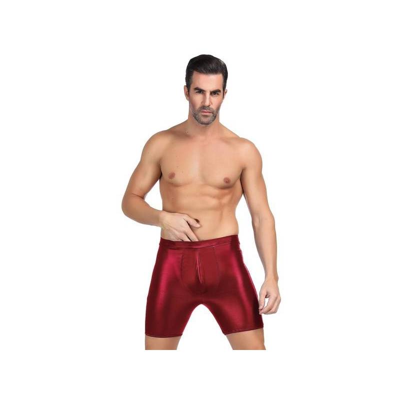 Lange Boxershorts aus bordeauxrotem Nylon in Wetlook-Optik.