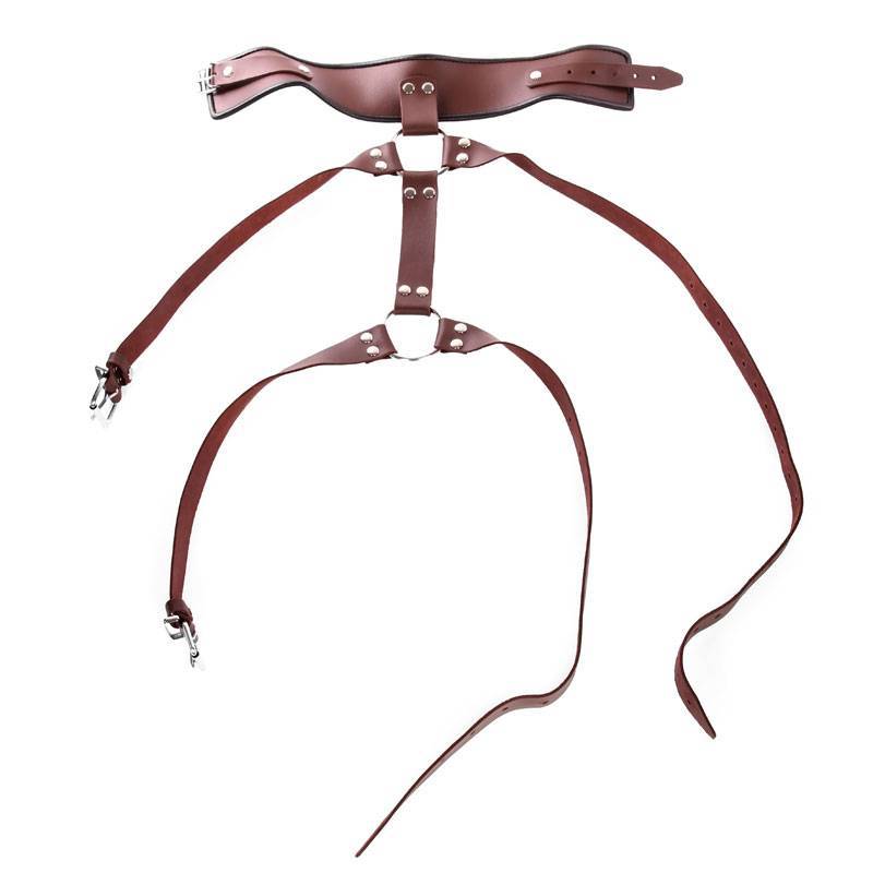 Brustgeschirr aus hochwertigen braunen Lederbändern, die mit Metallringen verbunden sind. Das Halsband aus Leder ist mit einer Schnalle (5 verschiedene Positionen) und einem Lederstück auf der Vorderseite ausgestattet, das an das Halsband genietet ist und durch das der Ring, der das Halsband mit dem Rest des Geschirrs verbindet, gezogen werden kann.