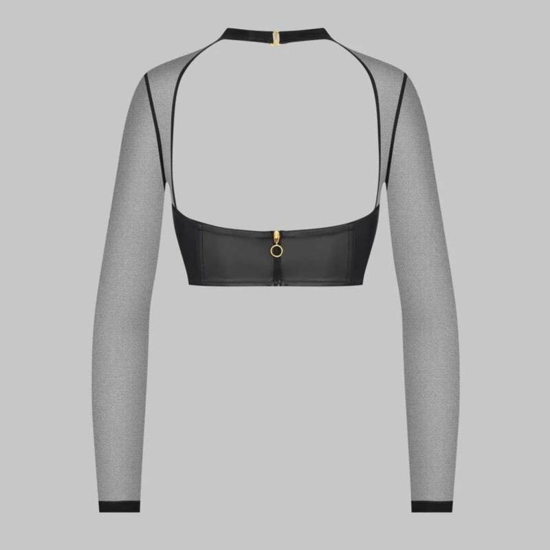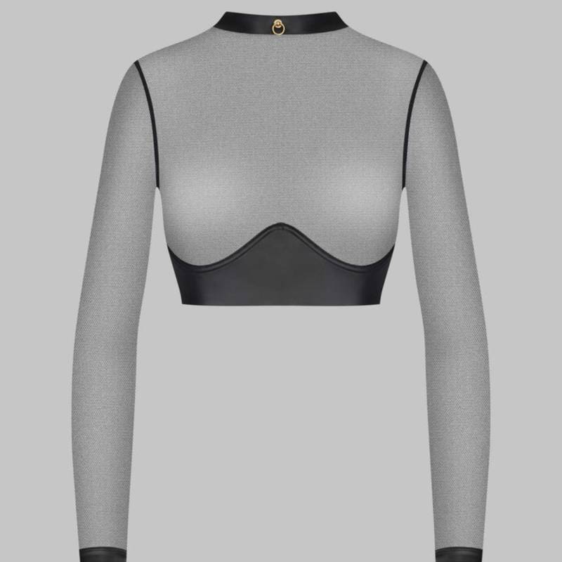 Die Kunst, elegant und gewollt provokant zu seinDoppelter matter Ledereffekt um die Taille und transparenter Tüll von vorne bis hinten Signatur der Kollektion Ein goldener "Fetisch-Chic"-Ring ziert die Vorderseite und suggeriert Verbundenheit.
