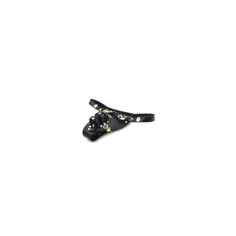 Dieser Slip besteht aus einem Vorderteil in Dreiecksform mit einem kleinen genieteten Ring auf jeder Seite oben, einer Öffnung zum Einführen des Geschlechts mit ebenfalls 3 Ringen und einem Käfig aus kleinen Lederriemen, die miteinander und mit einer Basis mit 3 Ösen vernietet sind, um befestigt und mit einem Vorhängeschloss gesichert zu werden (oder auch nicht).