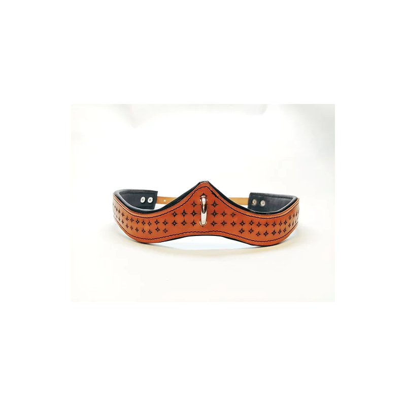 Ein Steg zum Anbinden, wie es Ihnen gefällt, auf bernsteinfarbenem Leder, kombiniert mit einer Polsterung, die aus schwarzem Lammleder genäht und mit einer Lyra-Schnalle geschlossen wird.