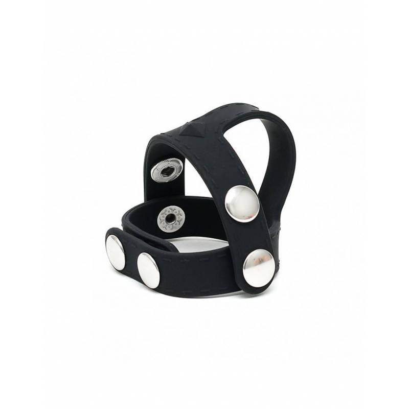Cockring ganz aus weichem Silikon, verstellbar mit 3 Druckknöpfen, bestehend aus einem weiteren verstellbaren Riemen mit 2 Druckknöpfen, um die Hoden zu trennen.