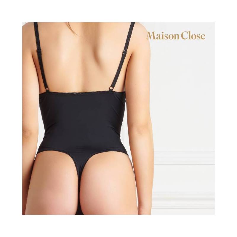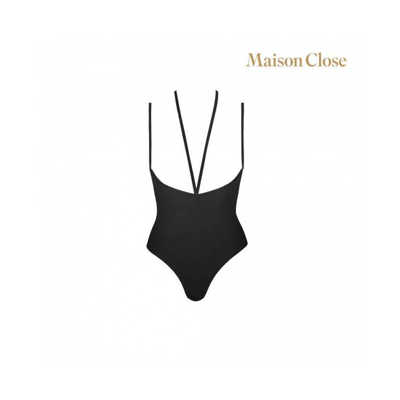 Wunderschöner, minimalistischer, schwarzer String-Body von Maison Close, oben ohne mit einem erhabenen Spiel von Riemen.