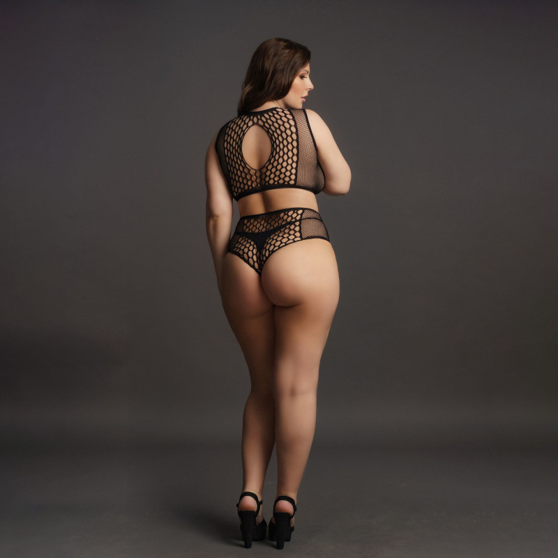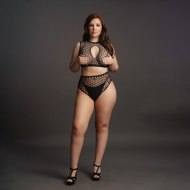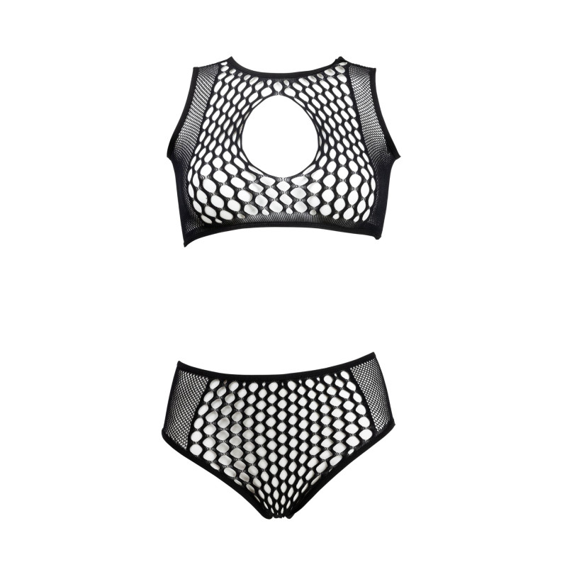 Die gewagte Mischung aus Netz und Mesh schafft eine fesselnde Textur, die Ihre Haut suggestiv durchscheinen lässt. Jedes Element dieses Sets ist so konzipiert, dass es Ihre Sinne anregt und es Ihnen ermöglicht, Ihre verführerische Seite zu erkunden.