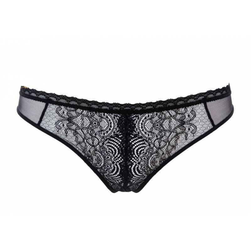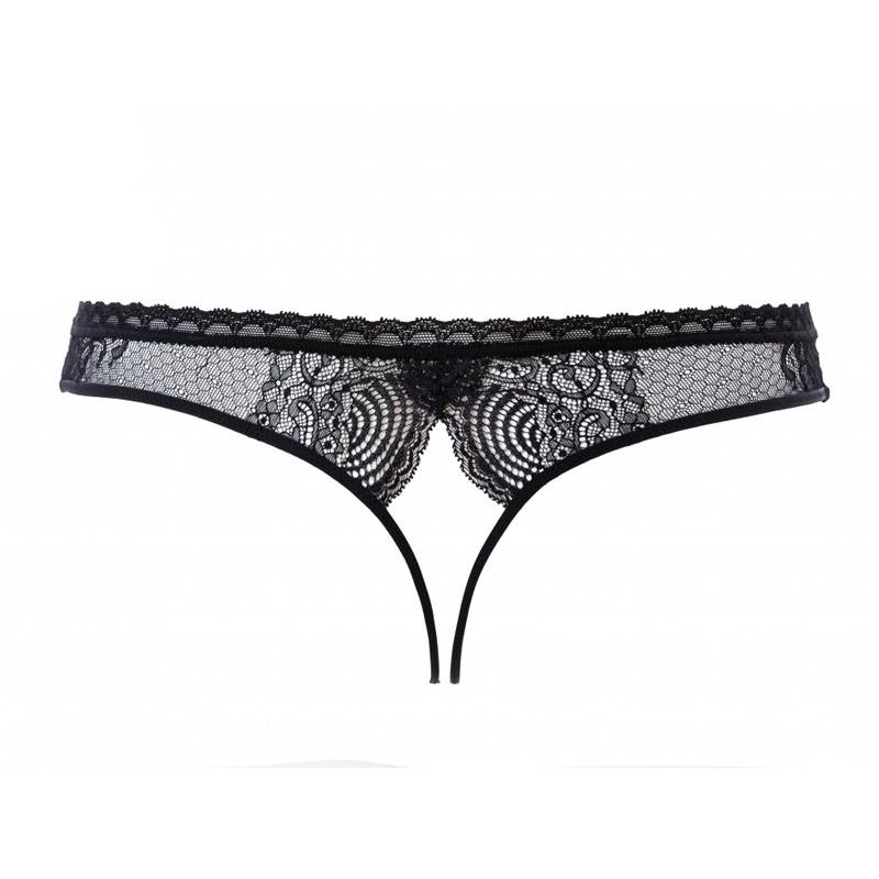Schwarzer Spitzenstring, der so gefertigt ist, dass es sehr einfach ist, das Geschlecht zu entdecken, ohne den String auszuziehen.