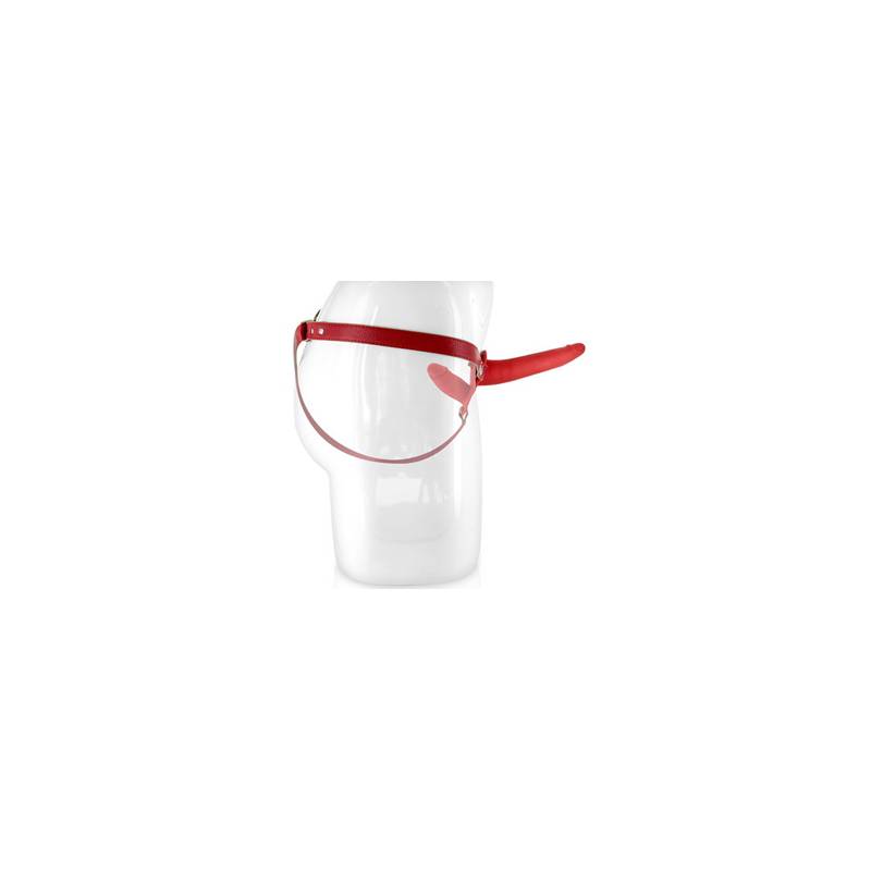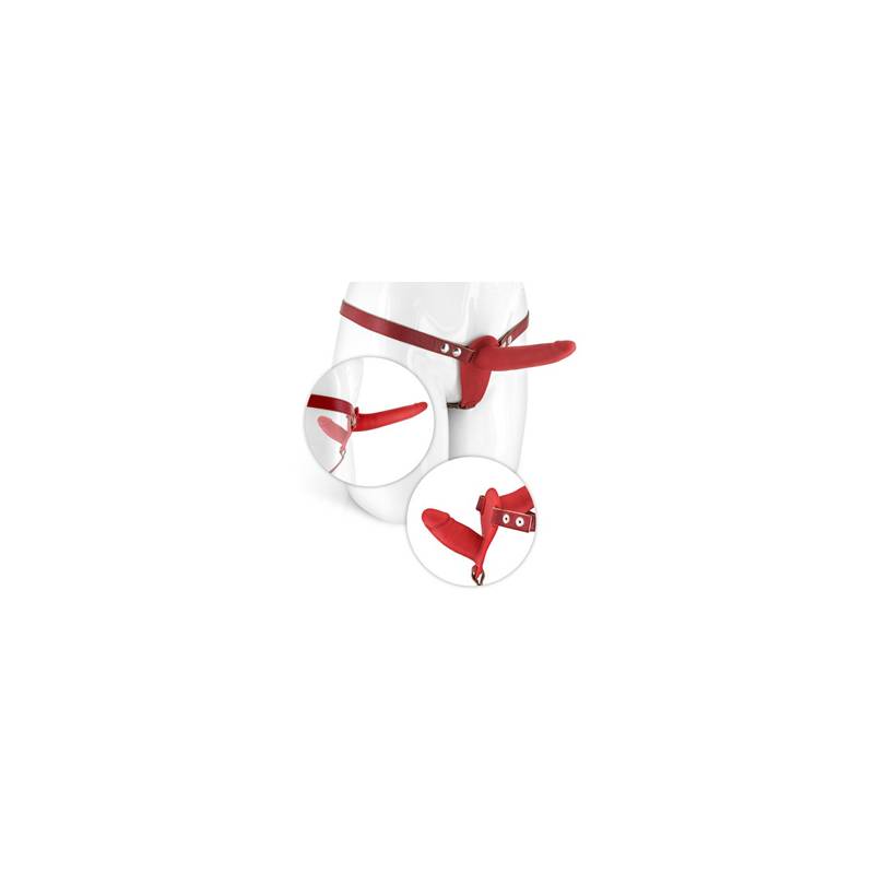 Gürteldildo bestehend aus einem Harnischteil aus dünnem, weichem, roten, leicht rissigen Leder und einem inneren UND äußeren Dildoteil aus Silikon, ebenfalls rot.
