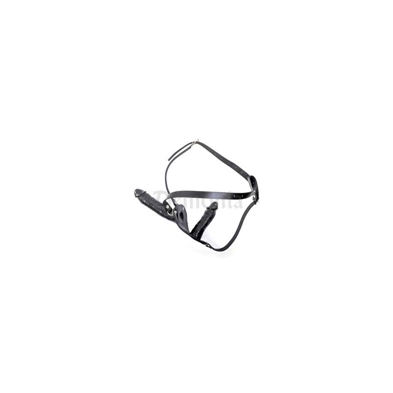 Doppeldildo mit 3 Lederriemen, die mit Schnallen verstellbar sind.