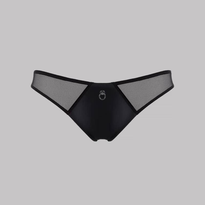 Der Slip aus dem vertraulichen Chambre Noire hat eine Vorderseite mit Stoff in Lederoptik und Tüll sowie einen anthrazitgrauen Ring.