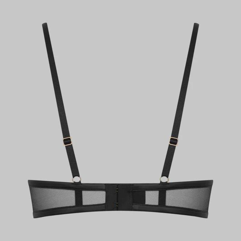 Die Kunst, elegant und gewollt provokant zu seinDoppelter matter Ledereffekt um die Taille und transparenter Tüll von vorne bis hinten Signatur der Kollektion Ein goldener "Fetisch-Chic"-Ring ziert die Vorderseite und suggeriert Verbundenheit.