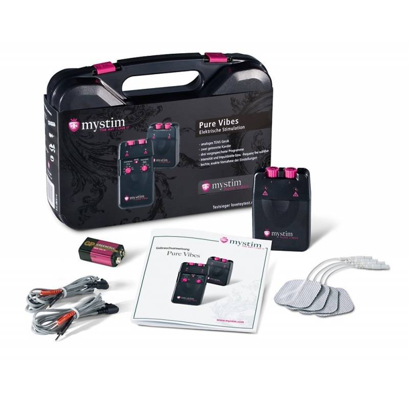 Das "Pure Vibes Mystim"-Gerät ist ein Elektrostimulationsgerät für eine kontinuierliche Stimulation, die je nach gewähltem Modus aus sanften Kribbeln, rhythmischen Pulsen und sinnlichen Impulsen besteht.