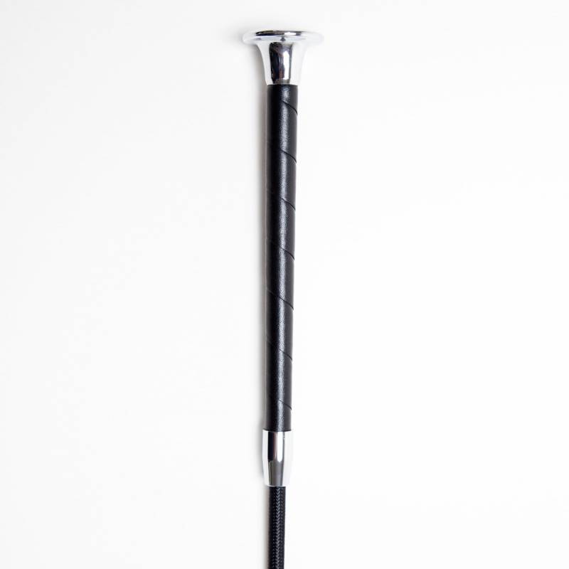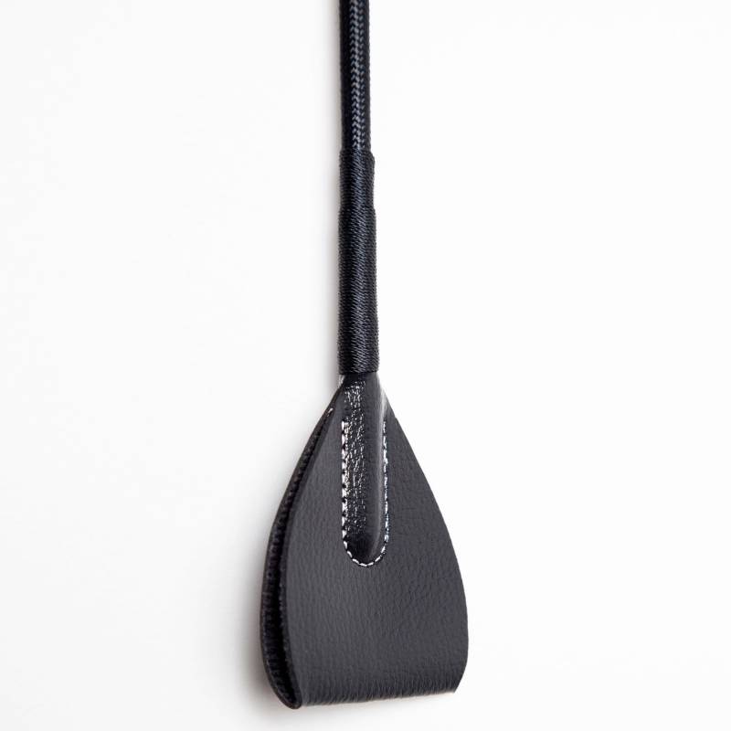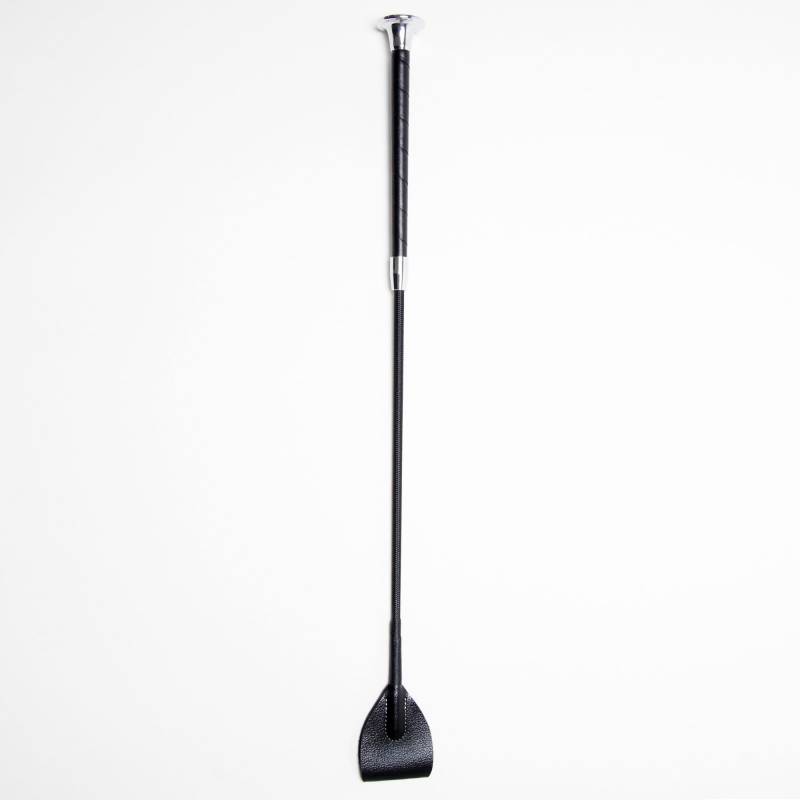 Eher steife lange Gerte mit breitem Docht aus Kunstleder und dünnem Griff, der in einem Metallstopp endet.
