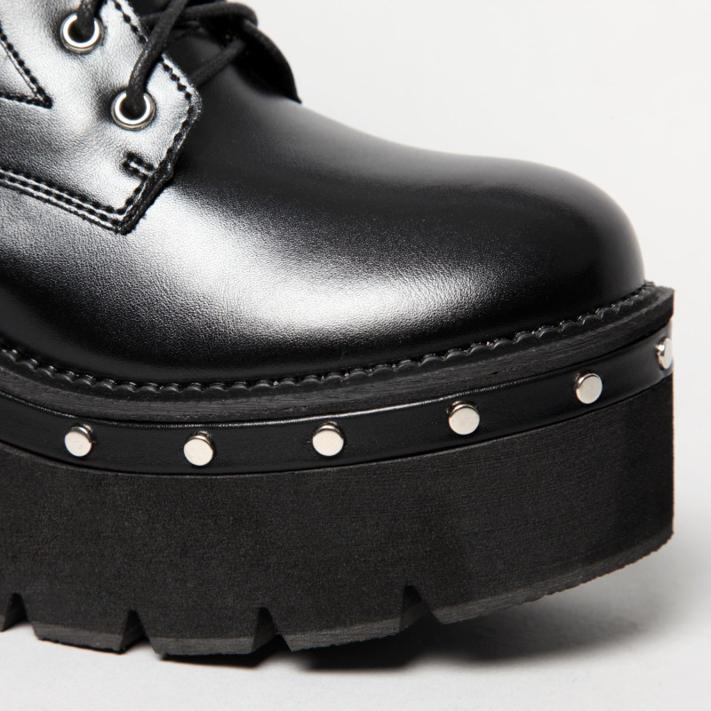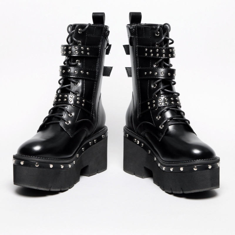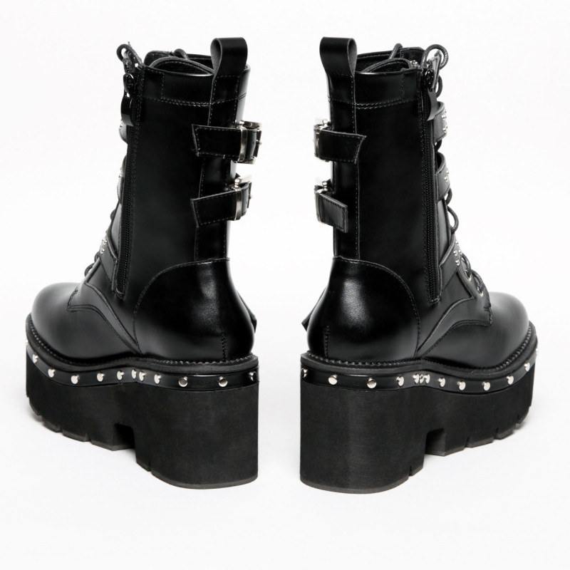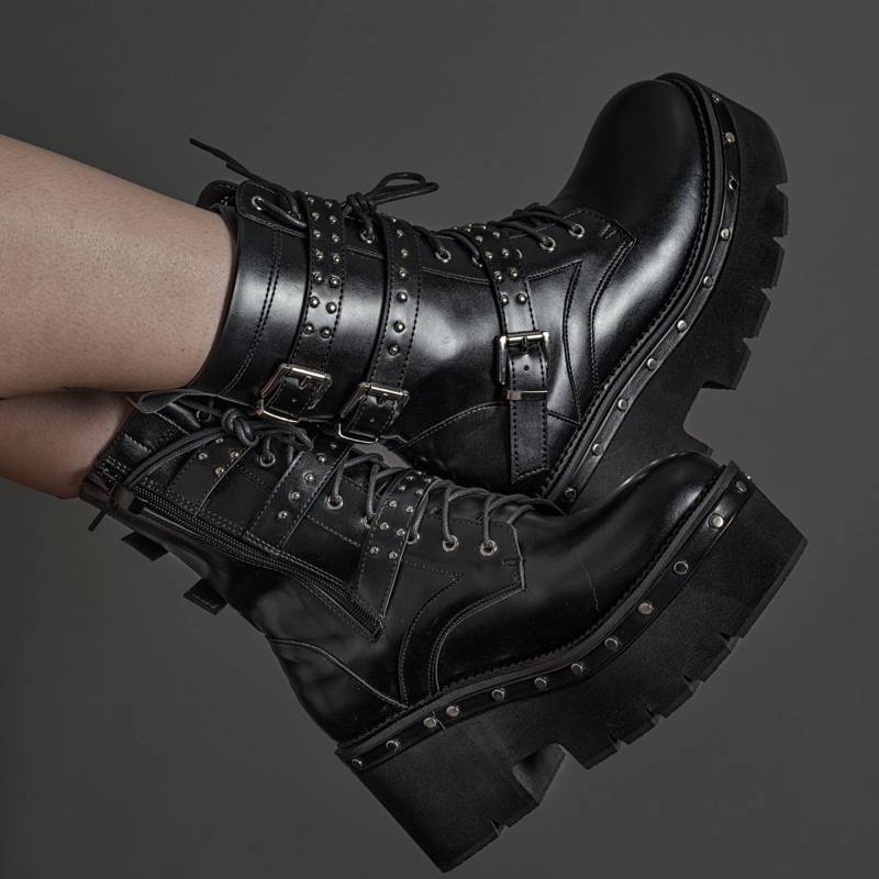 Behaupten Sie Ihre Identität mit den Gothic-Stiefeletten MERULA, einem einzigartigen Stück, das düstere Ästhetik und futuristischen Look perfekt miteinander verbindet. Inspiriert von der Gothic- und Techno-Welt sind diese Schuhe mehr als nur ein Accessoire: Sie sind ein Statement, eine Haltung, ein Lebensstil.