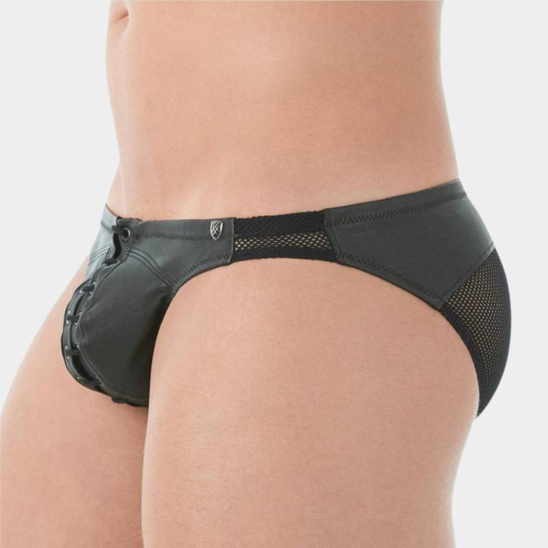 Für ein sexy Outfit mit diesem Slip aus Kunstleder und seiner Schnürung auf der Vorderseite für einen attraktiven, modischen Touch