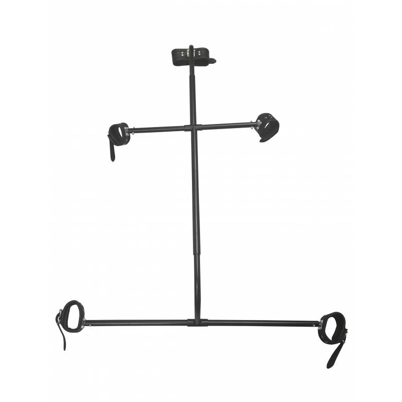 - Eine erste Hauptstange mit Schraubgewinde, sodass die Stange für die Handgelenke eingestellt und gehalten werden kann und die beiden gebogenen Stangen für Hals und Fußgelenke eingefügt werden können.
