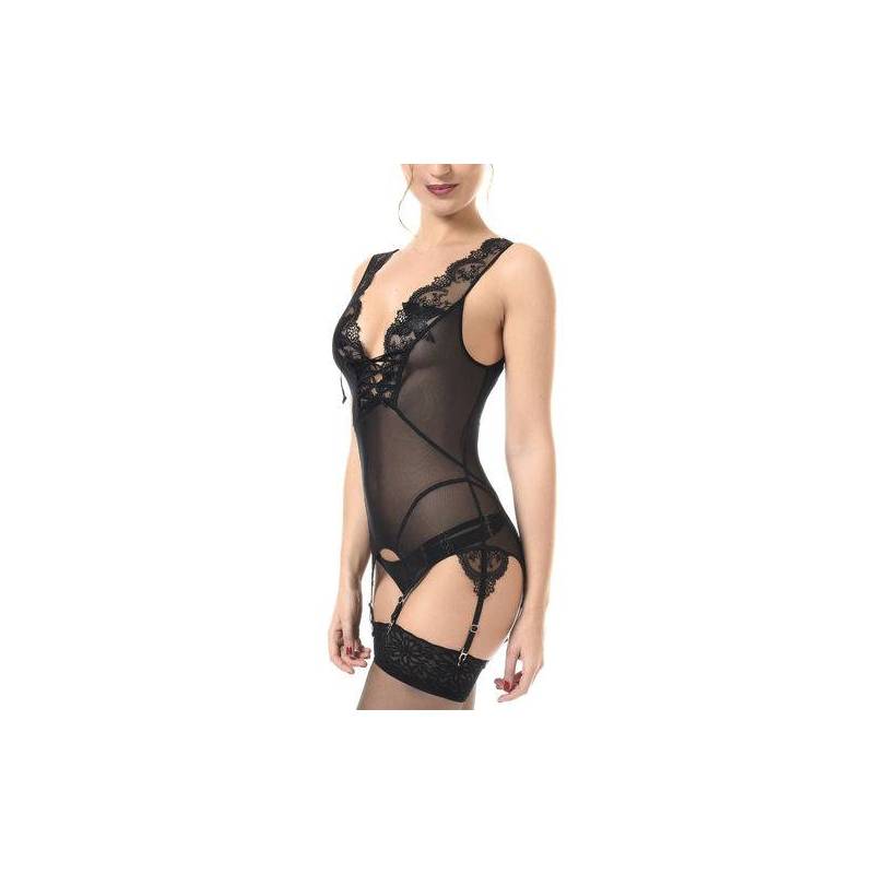 Guêpière aus schwarzem Voile mit Spitze, die Brust und Rücken sublimiert. Wunderschöner Neckholder, der am unteren Rücken mit einem spitzenverzierten Reißverschluss geschlossen wird.