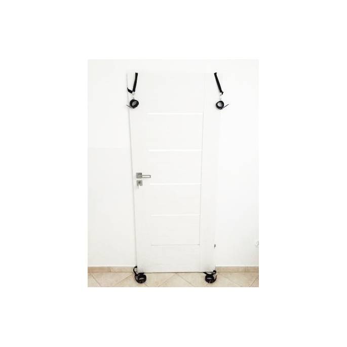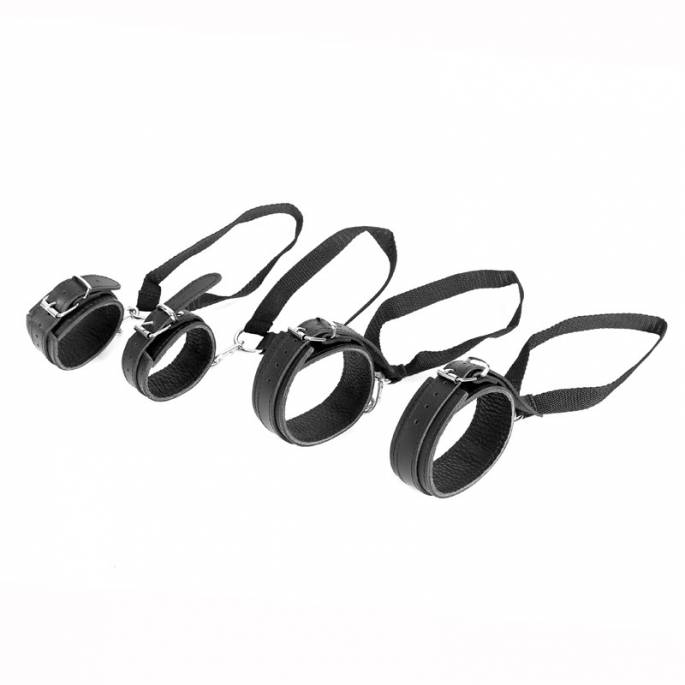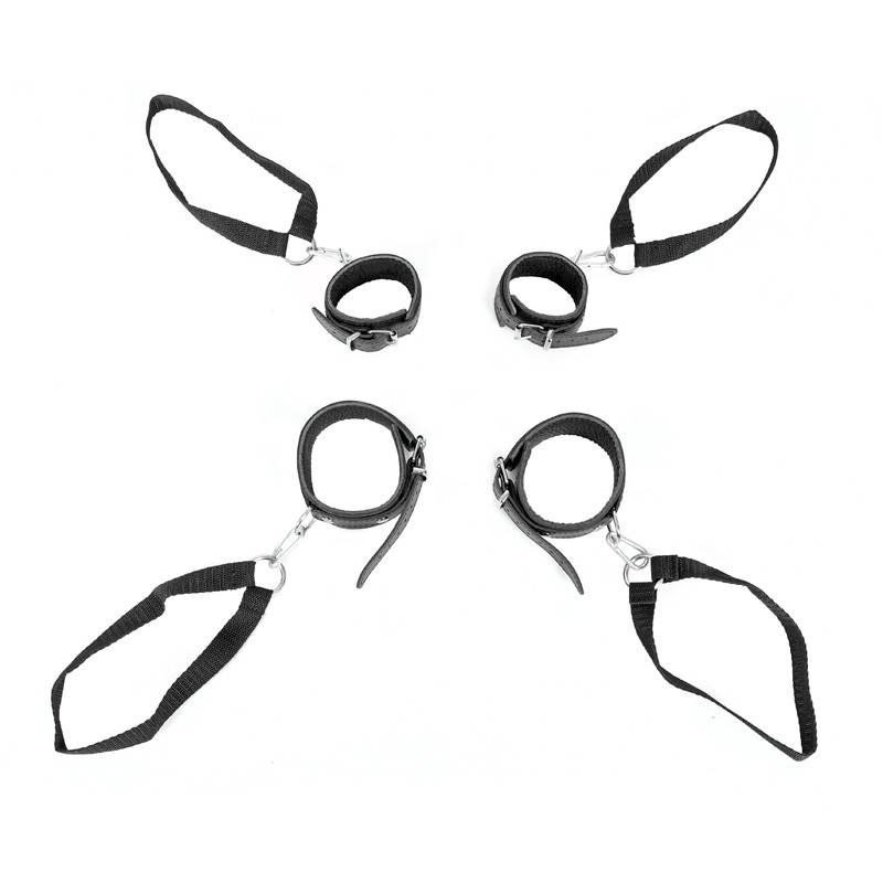 Set bestehend aus 2 Handschellen und 2 Fußfesseln mit je einem Karabinerhaken, der mit einem Nylonriemen verbunden ist, mit dem man sich an einer Türecke befestigen kann.