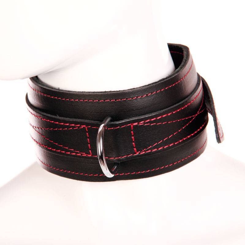 Halsband aus schwarzem Leder mit roter Naht. Innen fleecegefüttert.