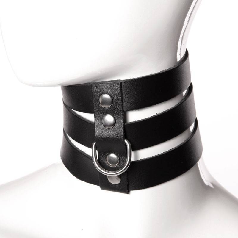 Hübsches Halsband aus 3 schwarzen Lederriemen, die untereinander an einen ebenfalls aus Leder bestehenden Riemen mit Metallring auf der Vorderseite genietet sind.