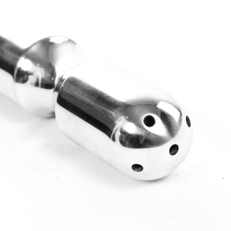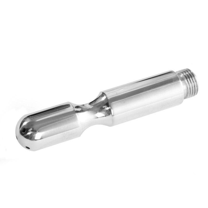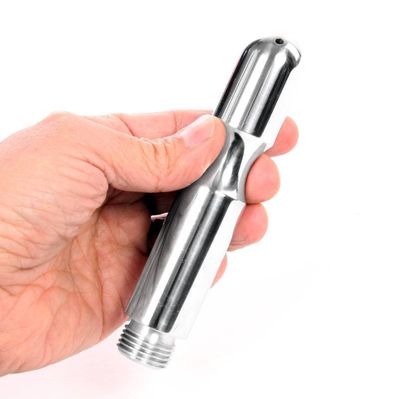 Einlaufbrause in zylindrischer Form, die zum Ende hin leicht gebogen ist, was für einen guten Halt sorgen wird, wenn sie einmal angebracht ist. Am Ende der Handbrause befinden sich 5 Löcher für den Wasserdurchfluss und ein Schraubgewinde an der Basis der Handbrause, um sie an einen Duschschlauch anzubringen.