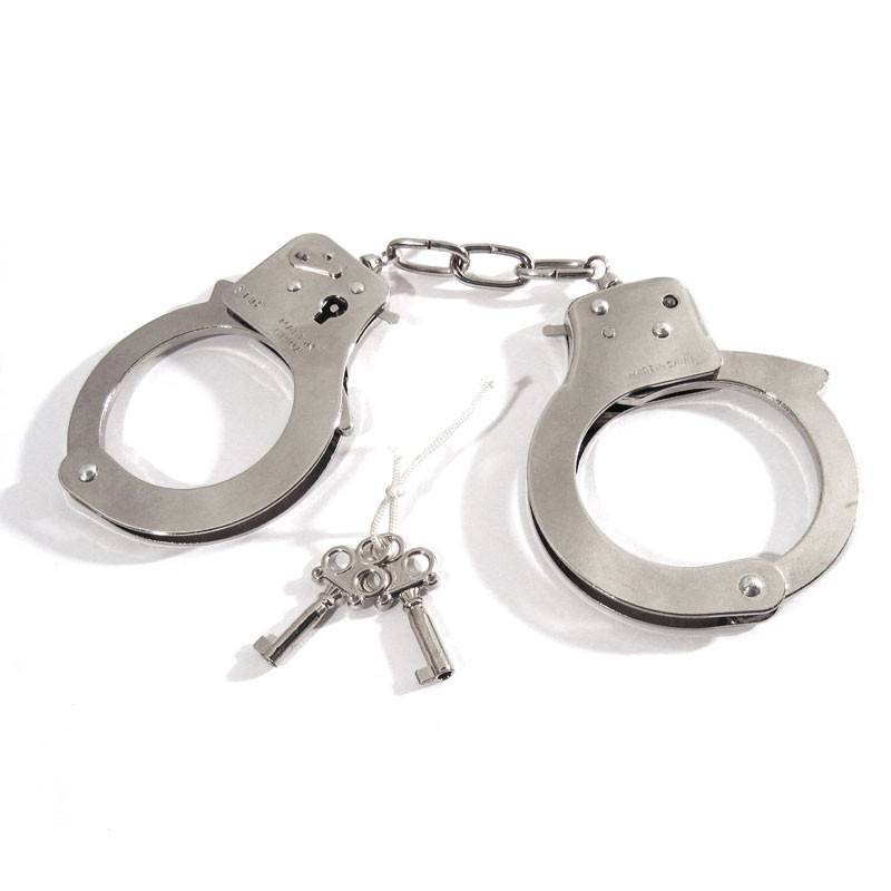 Handschellen aus Stahl mit einer kleinen Kette von 5 cm Länge.