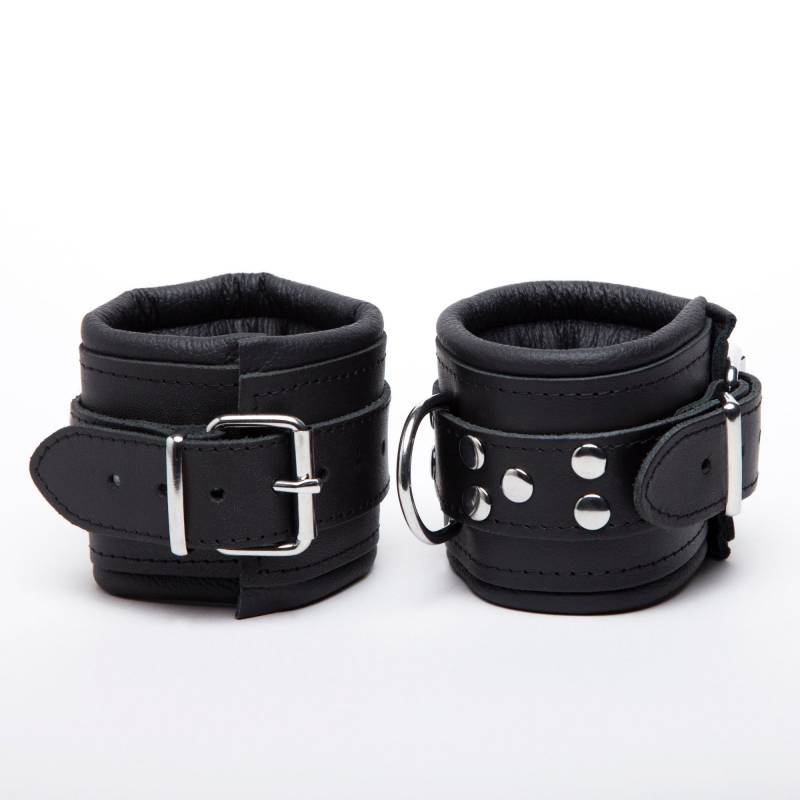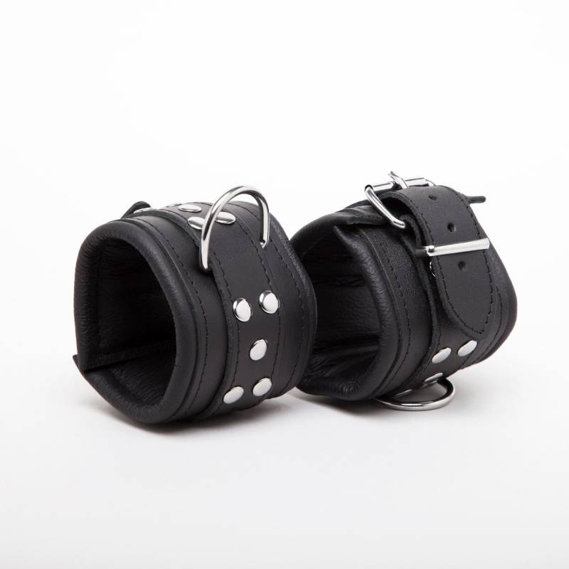Handschellen aus schwarzem Leder, die mit Fleece gefüttert sind und daher sehr bequem sind.