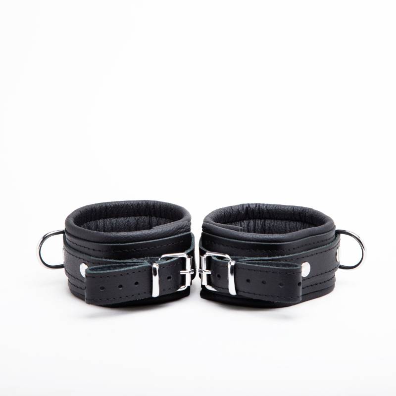 Die Handschellen sind innen elegant mit Fleece gefüttert, um bei der Benutzung optimalen Komfort zu bieten. Ihre glatte Oberfläche aus schwarzem Leder verleiht ihnen ein praktisches und schickes Aussehen.