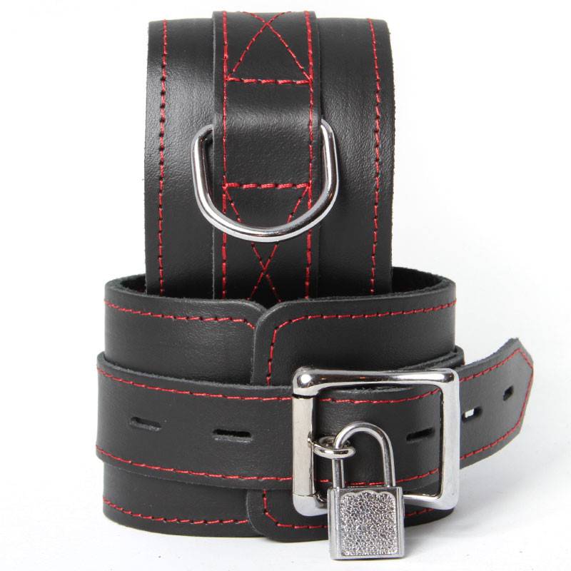 HANDSCHELLEN AUS SCHWARZEM LEDER MIT ROTEN NÄHTEN
