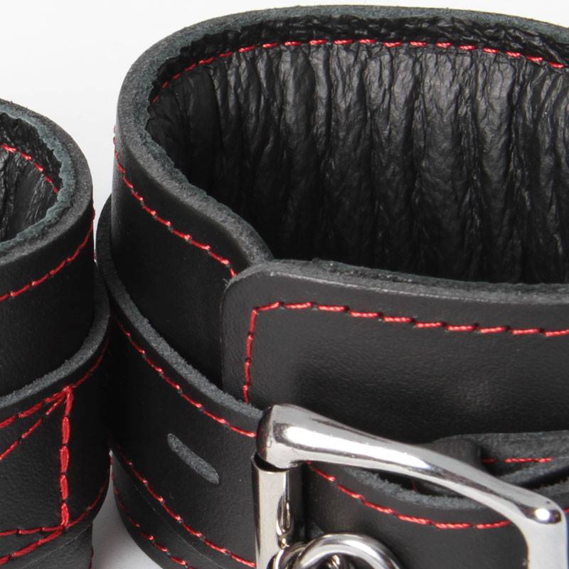 Schwarze Lederhandfesseln mit roten Nähten an der Außenseite, sehr gute Qualität.