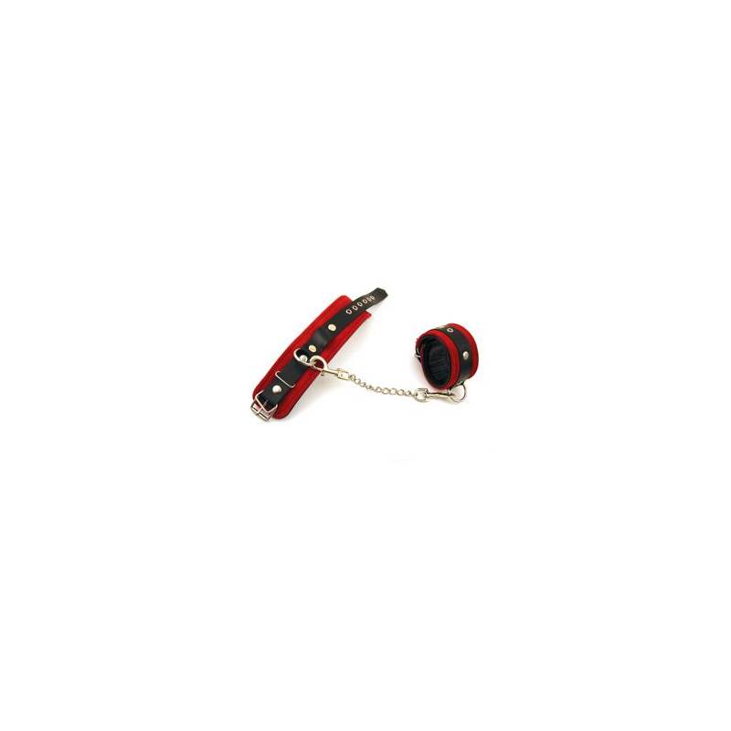Wunderschöne Handschellen aus rotem Spaltleder, mit schwarzem Leder gefüttert, mit je einem vernieteten schwarzen Lederriemen mit verstellbarer Schnalle und einem Ring.
