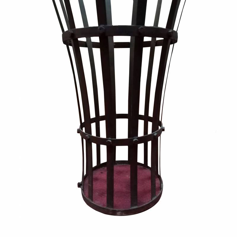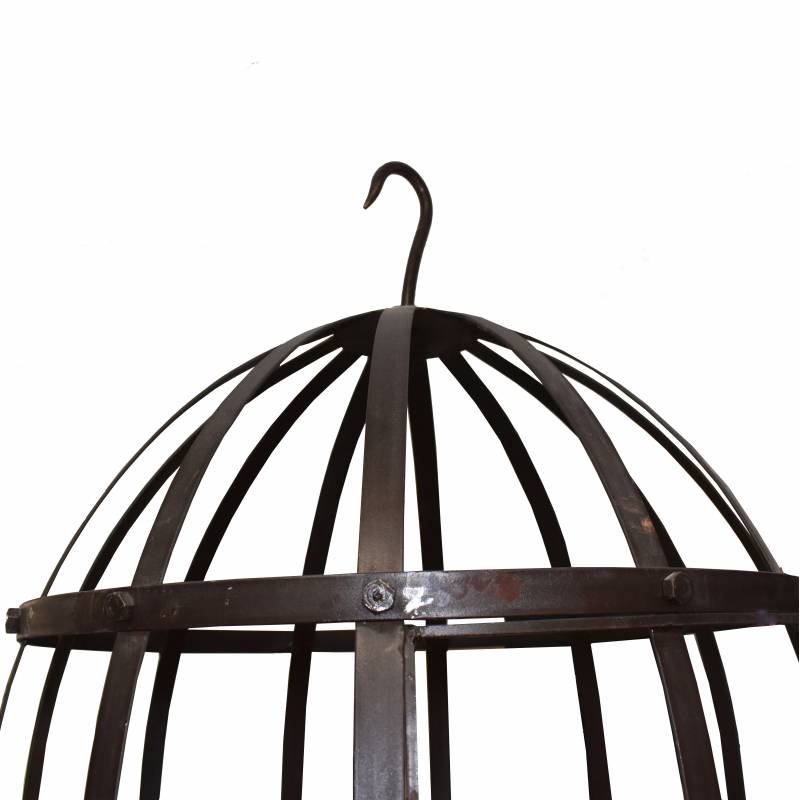 Ein Metallkäfig mit einem Haken an der Oberseite zum Aufhängen.