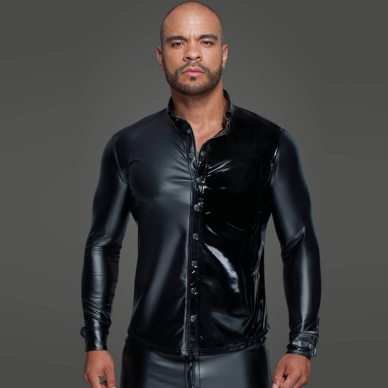 Ärmelloses Hemd aus Wetlook in Lederoptik. Reißverschluss an der Längsseite Kapuze aus Stoff