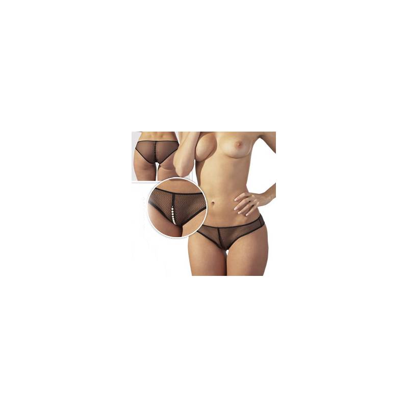Slip "klassischer Schnitt" aus schwarzem, transparentem Voile mit einem Dutzend kleiner, runder und feiner Perlen mit einem Durchmesser von 2 mm, die sich im Inneren des Slips befinden und vertikal entlang des Geschlechts angeordnet sind.