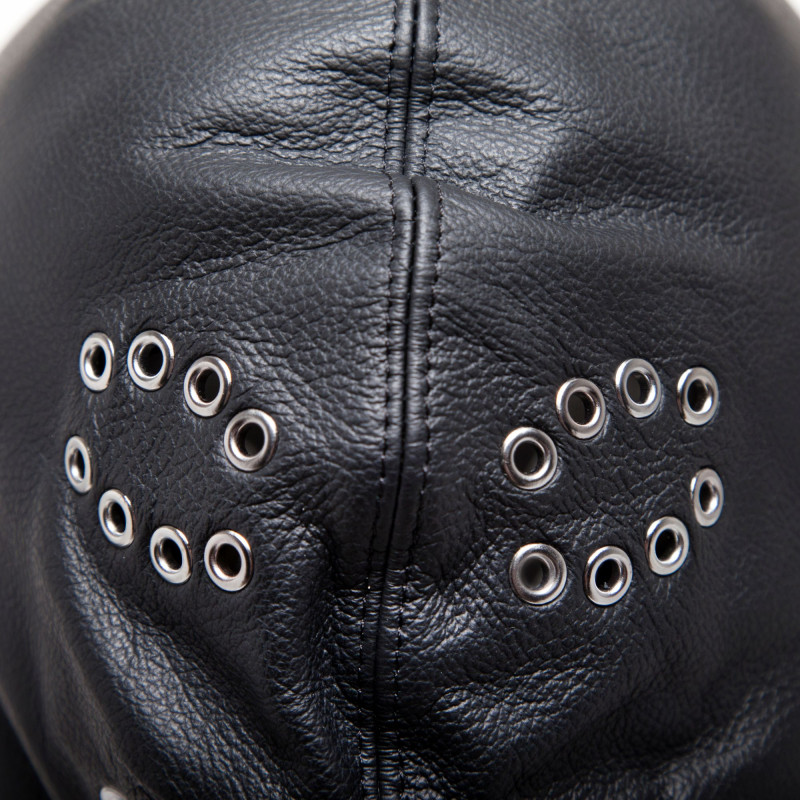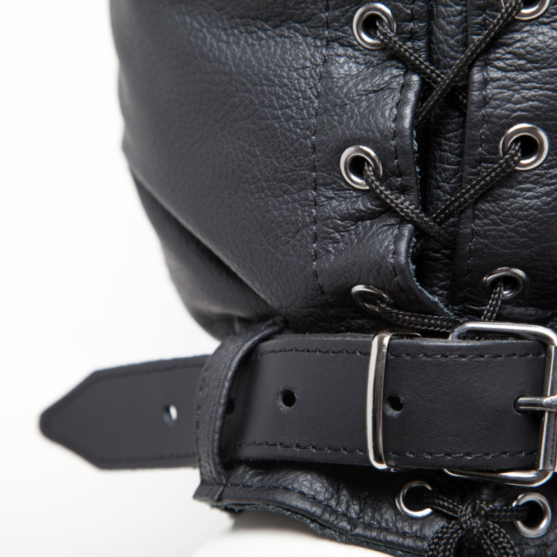 Entdecken Sie diese wunderschöne Isolationshaube aus Leder mit ihrem abnehmbaren Kopfband und der Schnürung, mit der Sie die Haube hinten enger schnüren können, um den Zwang Ihres Partners zu betonen.