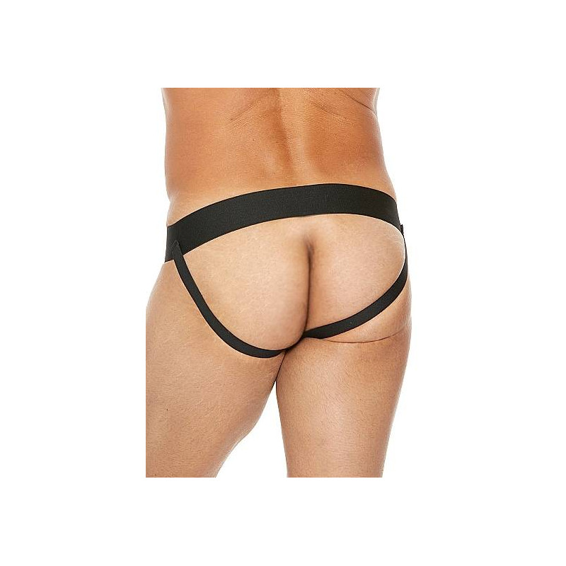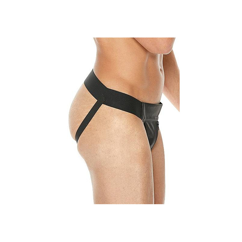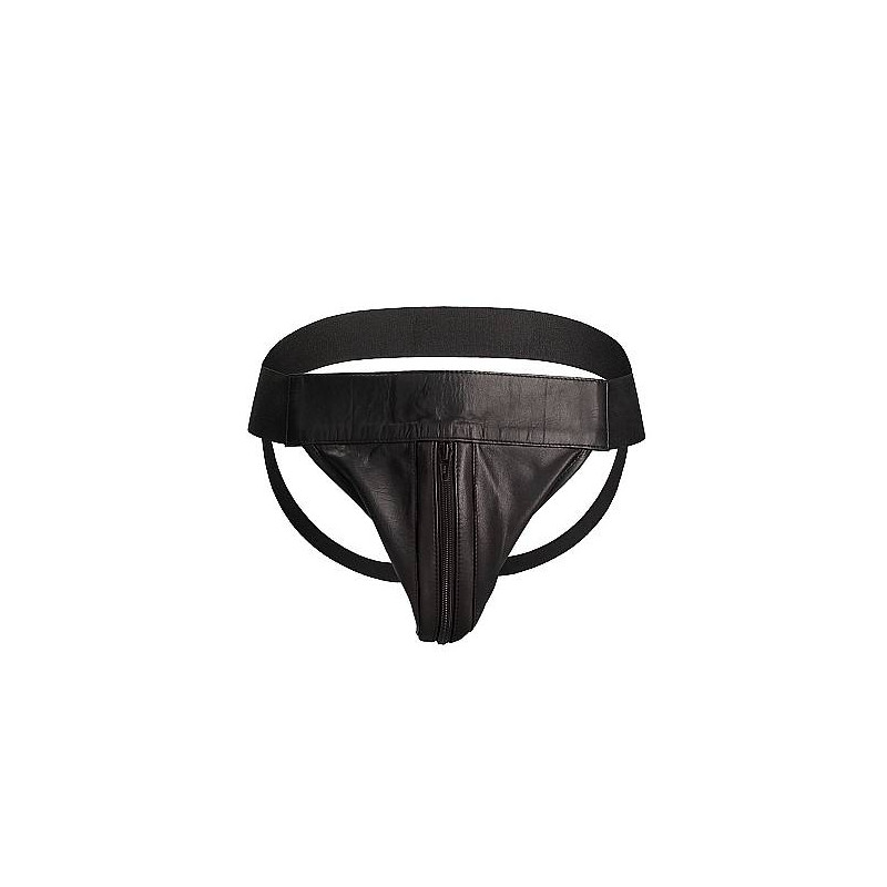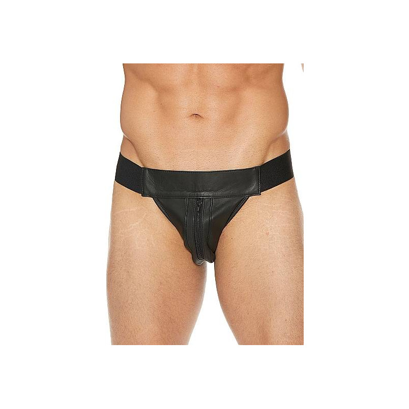 Lederjockstrap mit elastischen Riemen und Reißverschluss an der Vorderseite.