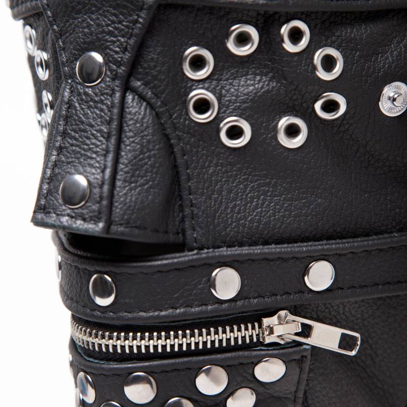 Stellen Sie sich Ihren Partner maskiert unter dieser SM-Haube aus Leder mit Nieten vor, wobei der Reißverschluss jede Geste und jeden Atemzug verstärkt. Die abnehmbare Augenbinde verstärkt die sensorische Deprivation und lässt Raum für erregende Spannung und eine Dynamik der totalen Kontrolle.