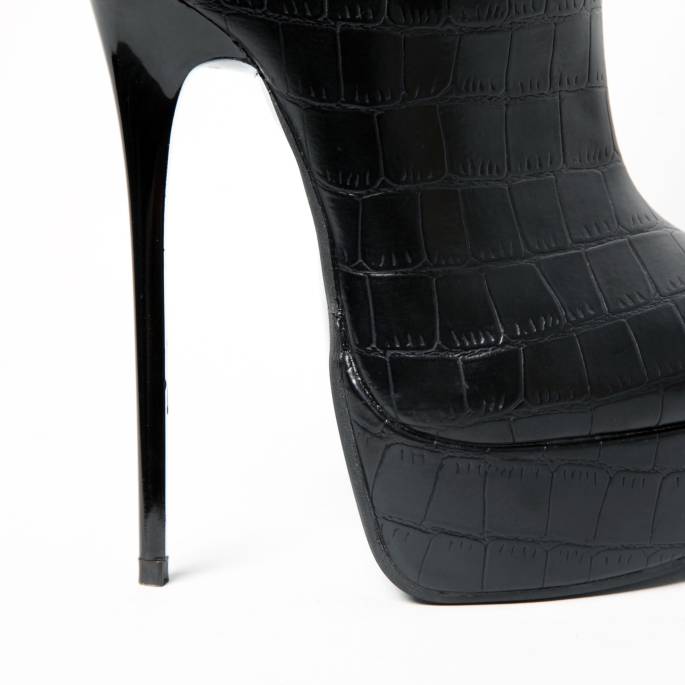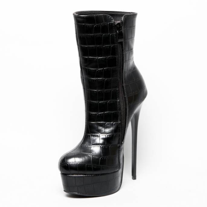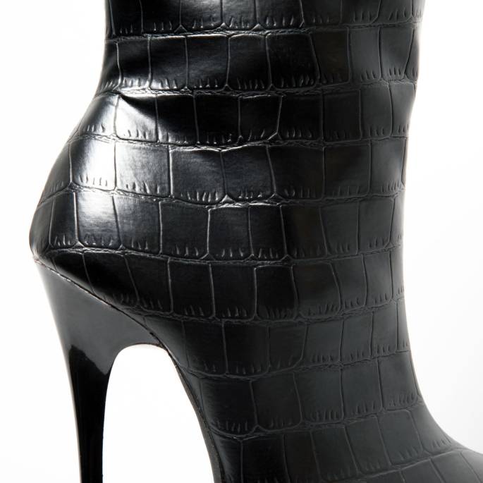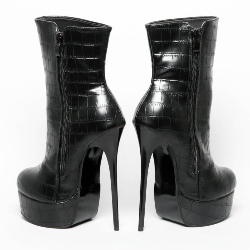 Mit ihrer dezent glänzenden Schlangentextur ist diese Fetish-Stiefelette die perfekte Wahl für einen Abend im Club oder für einen Fetish-Look im Alltag. Mit einem 15 cm hohen Pfennigabsatz und einem 4 cm hohen Plateau hebt sie Sie buchstäblich über die Menge hinaus. Die Stiefelette ist 30 cm hoch (einschließlich Absatz) und verfügt über einen praktischen Reißverschluss an der Seite, der das Anziehen erleichtert. Diese Stiefelette wird zweifellos das Highlight Ihres Fetish-Outfits sein.