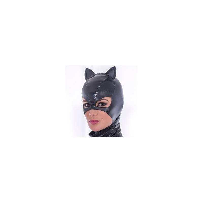 Katzenhaube "Beta", hergestellt aus lackiertem Lycra mit einem vertikalen Vinylstreifen in der Mitte, vorne UND hinten (hinten 7 cm). Eine Kreation von Patrice Catanzaro.