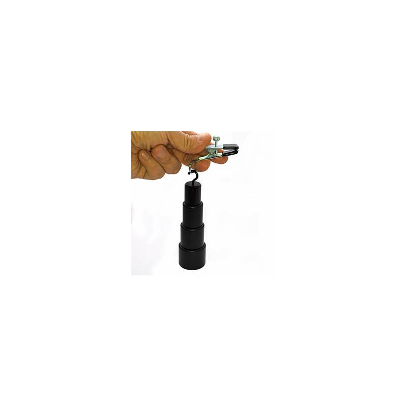Beachten Sie, dass nur das erste Gewicht über einen kleinen Haken verfügt, mit dem es an der Klemme befestigt werden kann. Das erste Gewicht muss also immer das 50-g-Gewicht sein.