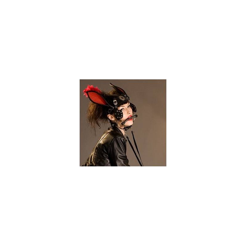 Hochwertiges Ledergeschirr mit Ohren (innen rot), Augenmuscheln mit Ziernägeln, einem PVC-Globus, der an zwei großen Metallringen befestigt ist, die wiederum mit einer Leine verbunden sind!