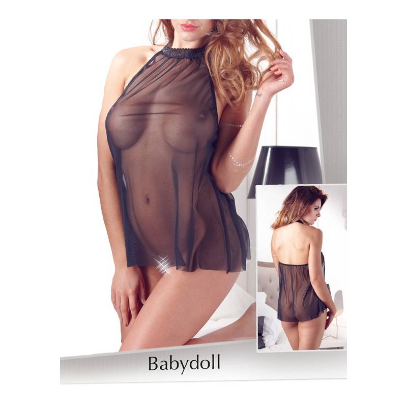 Tunika aus schwarzem, transparentem Voile mit einem Spitzenkragen, der mit einem kleinen Haken auf der Rückseite geschlossen werden kann.